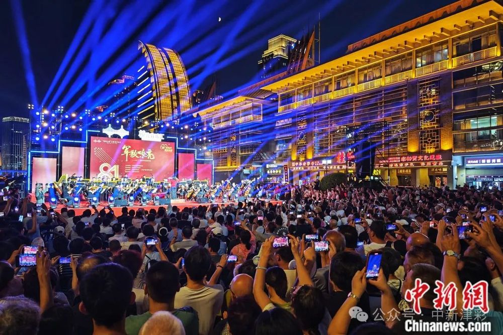 8月1日,天津海河畔,民众欣赏音乐会。当晚,“海河之夜”桥边音乐汇之军歌嘹亮“八一”建军节交响音乐会在古文化街亲水平台奏响。来自天津交响乐团的艺术家们为现场观众带来经典军旅歌曲,向中国军人致敬。中新社记者佟郁摄