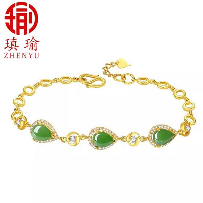 瑱瑜足金和田玉手链黄金镶嵌水滴碧玉手串金镶玉手镯金子手饰 足金和田碧玉手链